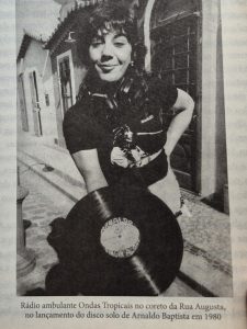 Mas o projeto dela que mais me inspirou mesmo, foi o Ondas Tropicais! Saca só: 1982, já no final da Ditadura Militar, Sonia Abreu inicia uma programação musical no formato de rádio, só que com a diferença de ser feita nas ruas! Sua rádio ambulante teve como estrutura um Fusca, uma Kombi, um trio elétrico… Pra ela não tinha tempo ruim: ela fazia acontecer, com o máximo de otimismo possível. Aliás, aproveito para citar as “palavras messiânicas”, como definiram Claudia Assef e Alexandre de Melo (na biografia de Sonia Abreu), que Sonia disse na edição inaugural da rádio ambulante: “Para vocês que sobem e descem a Rua Augusta, sobem e descem na vida, o sonho não acabou. O tempo é todo o tempo, e a música é a bíblia do futuro. Viva John Lennon!” – uma homenagem póstuma prestada ao Beatle, já que a DJ era fã da banda.
